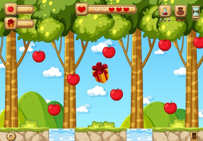Có 2 rổ cam và nho đặt 2 bên, người chơi sẽ phải kéo cam và nho đang rơi vào đúng rổ phù hợp để đạt điểm tối đa.