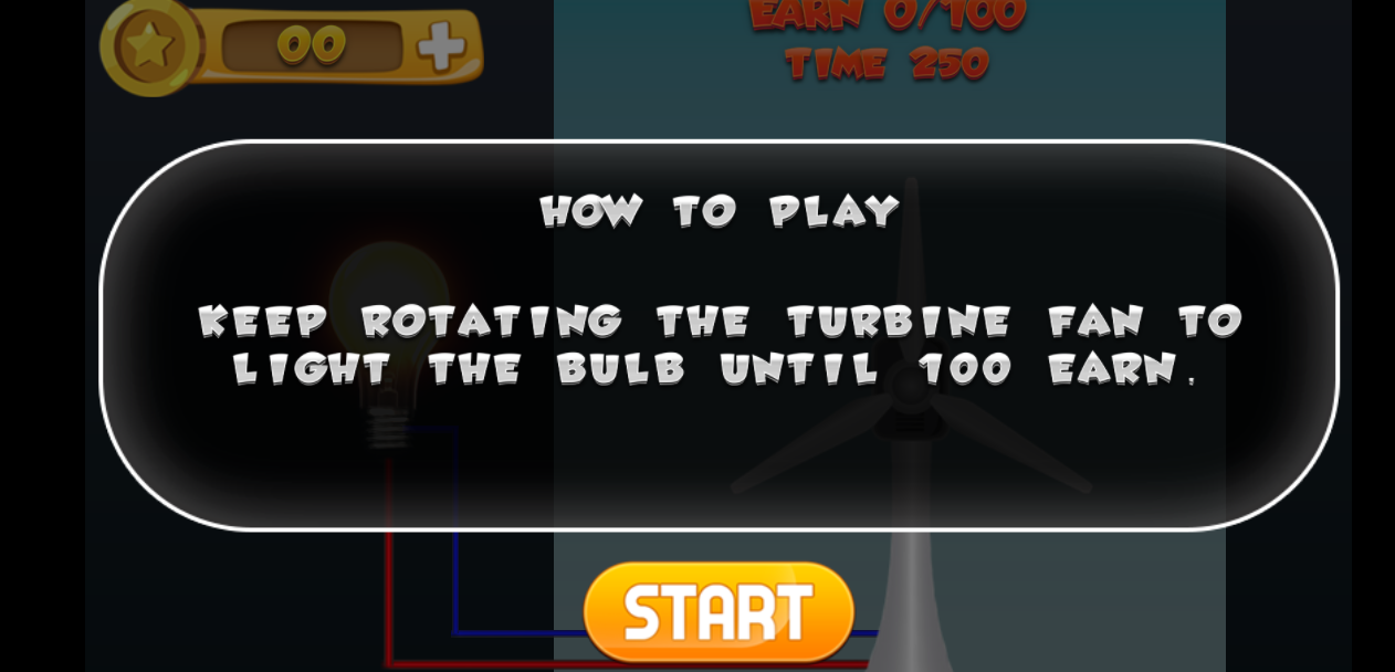 Trong khoảng thời gian giới hạn được đếm ngược là 250 giây, người chơi sẽ cần giữ cánh quạt của turbin quay liên tục để cấp điện thắp sáng bóng đèn. Lượt chơi sẽ hoàn thành khi bạn kiểm đủ 100 điểm năng lượng.