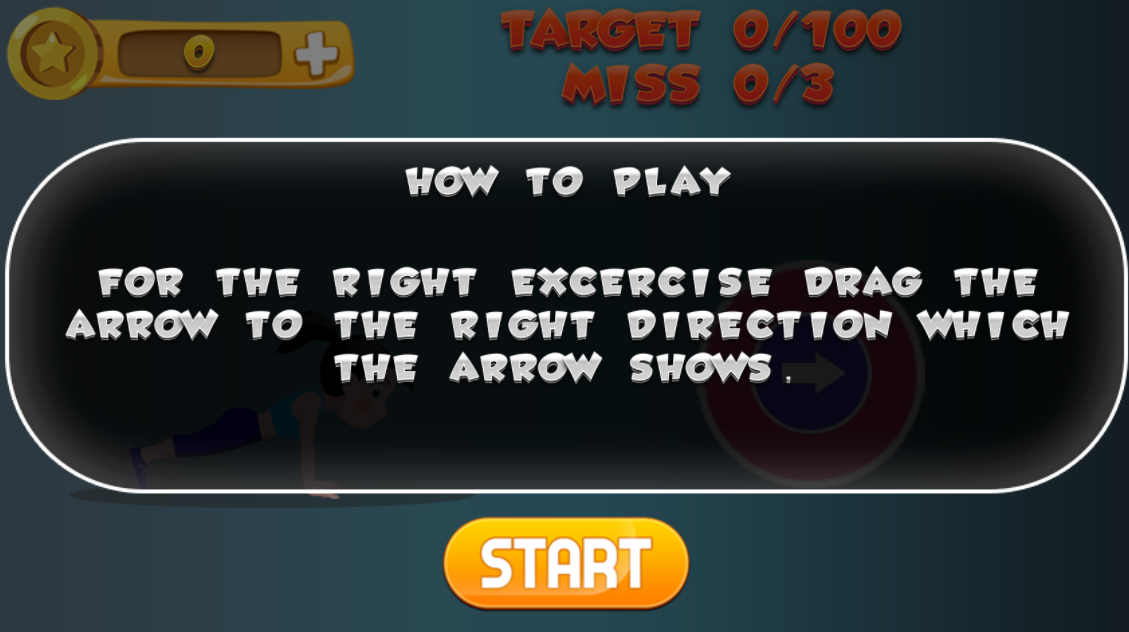 Tập thể dục đúng cách bằng cách kéo mũi tên đúng hướng mà mũi tên hiển thị. Mỗi lượt chơi có mục tiêu là 100 động tác đúng và bạn được lỡ tối đa 3 lần kéo mũi tên sai hoặc chậm.